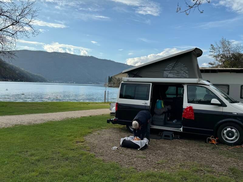 Der Campingplatz Monte Generoso empfängt uns dann mit klarem Wetter und mit schöner Sicht auf den Lago di Lugano. Schnell alles aufgebaut (ha, mit meinen Rippen geht jetzt halt nichts schnell, dafür darf Mägi viel mehr machen, Dach aufstellen usw.), bevor es zum wohlverdienten Apéro in die kleine Campingplatz Bar geht.