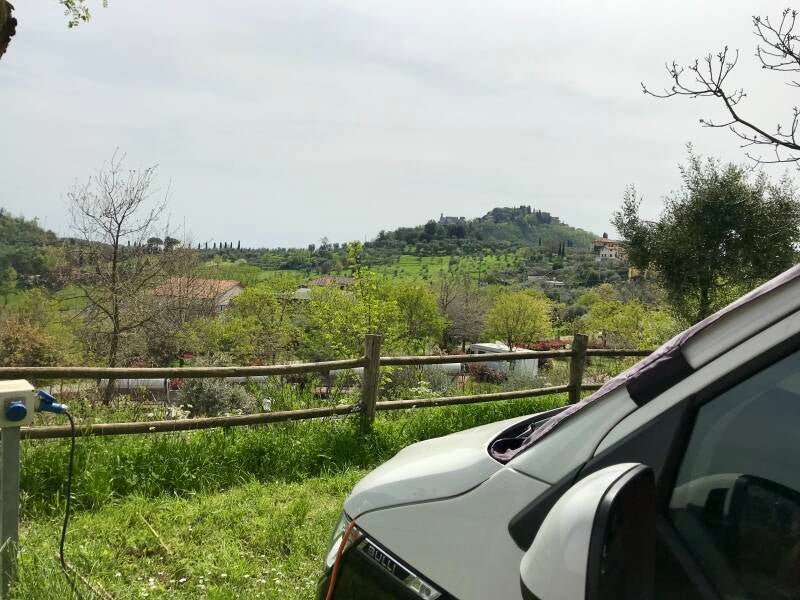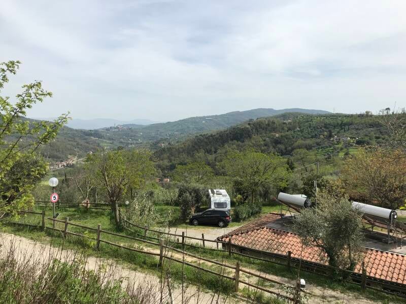 Wir fahren von Lucca nur eine Stunde weiter über Land Richtung Florenz und finden einen tollen Campingplatz oberhalb der Stadt Montecatini Terme. Wunderbare Sicht in die Hügel der Toskana, sehr ruhig, aber mit Bar und Pizzeria und grandiosem Ausblick auf die Toskana vom Platz aus.