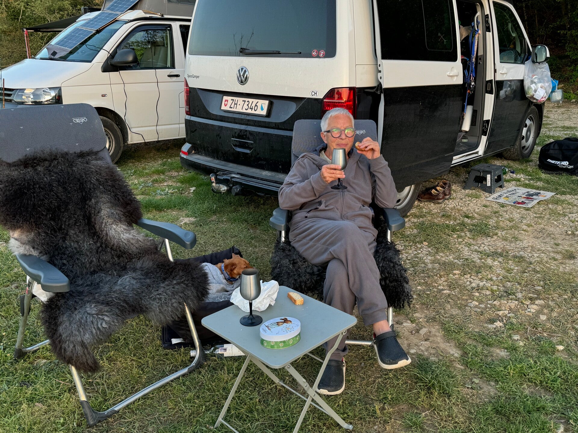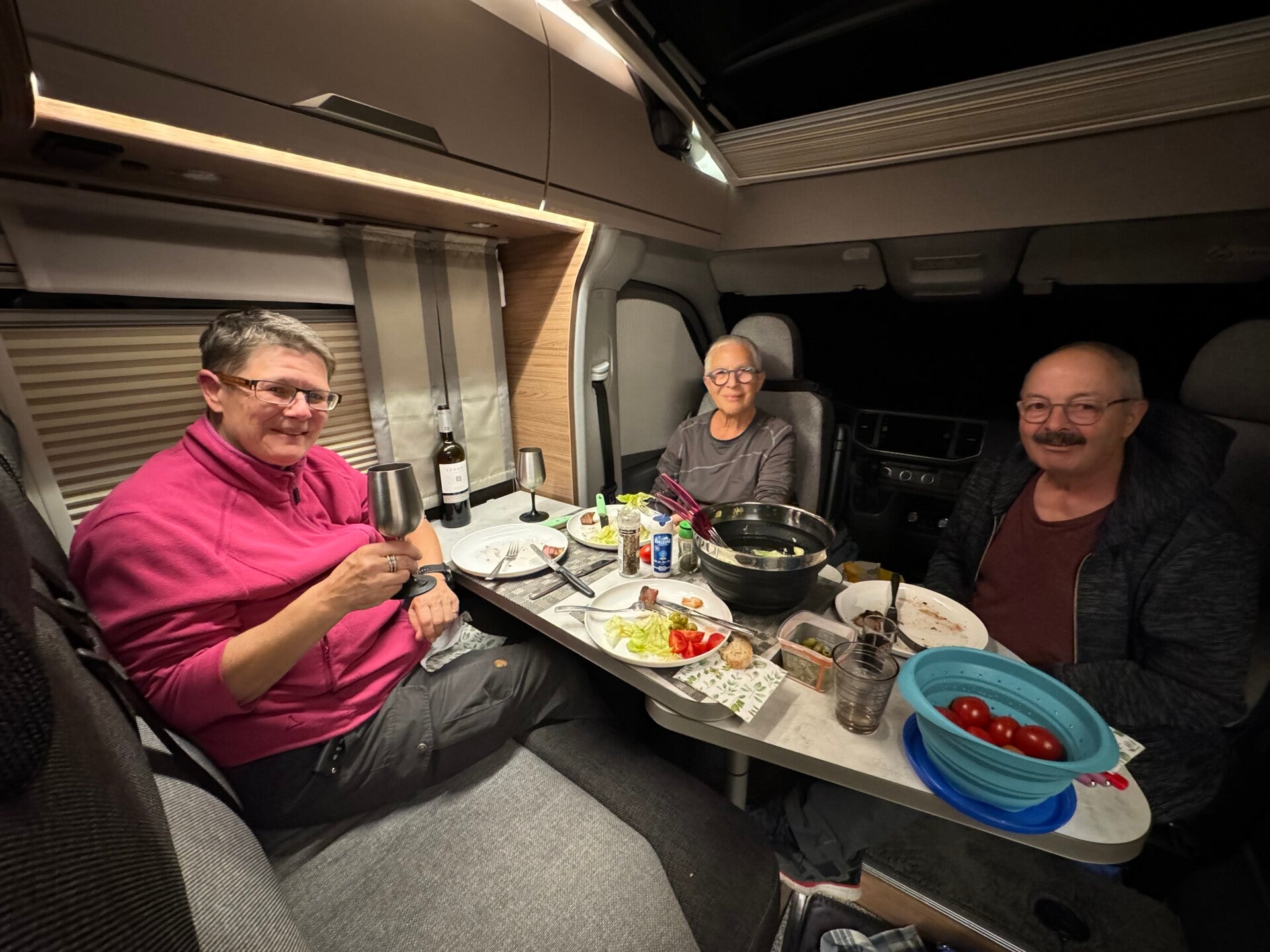 Anderthalb Stunden später sind sie hier und nun wissen wir auch wer die zweite Hälfte des Bisteca essen wird, und wie wir das Bisteca grillieren werden (sie haben einen Gasgrill!!). Im Dunkeln wird alles aufgebaut und der Apéro genossen, das Fleisch gegrillt, und da es doch schon etwas kalt ist, essen wir in ihrem grossen Wohnmobil. Wir verbringen eine schönen Abend zu viert und erst um Mitternacht verlassen wir ihr WOMO und gehen in unser Büssli.