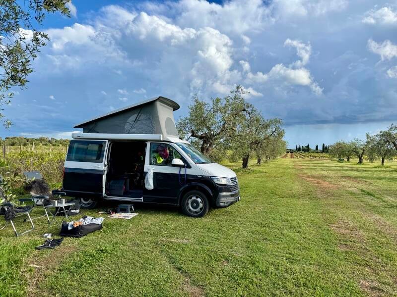 Nach dieser spannenden Ausstellung, fahren wir zu unserem nächsten Übernachtungsplatz, der nur 2 Minuten entfernt liegt. Die Azienda Agricola Fratelli Barile bietet uns ein traumhaftes Plätzchen zwischen Reben und Olivenbäumen. Wir sind die einzigen Camper und geniessen die Stille und den absolut idyllischen Ort. Am Abend gibt’s dann das obligate Wein-Tasting, Flávio, der Winzer, ist sehr nett und seine Weine entsprechen genau unserem Geschmack - also noch eine Kiste Wein zwischen meinen Beinen! 😂😂