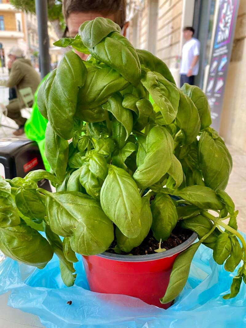 Kurz vor der Heimfahrt mit dem Shuttleservice fängt es kräftig an zu schütten und wir freuen uns ab den heutigen Errungenschaften. Gewürze und ein Basilikumtöpfchen vom Markt und ein Pistacchio Cannolo für heute Abend zum Dessert.