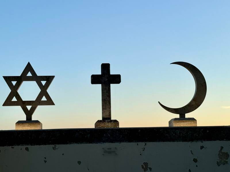 Wenn die Menschen doch nur so friedlich nebeneinander stehen könnten wie diese steinernen Symbole der monotheistischen Weltreligionen; was hätten wir für eine schöne Welt, ohne Hass und Intoleranz. (Cappella Nuova, San Marino).